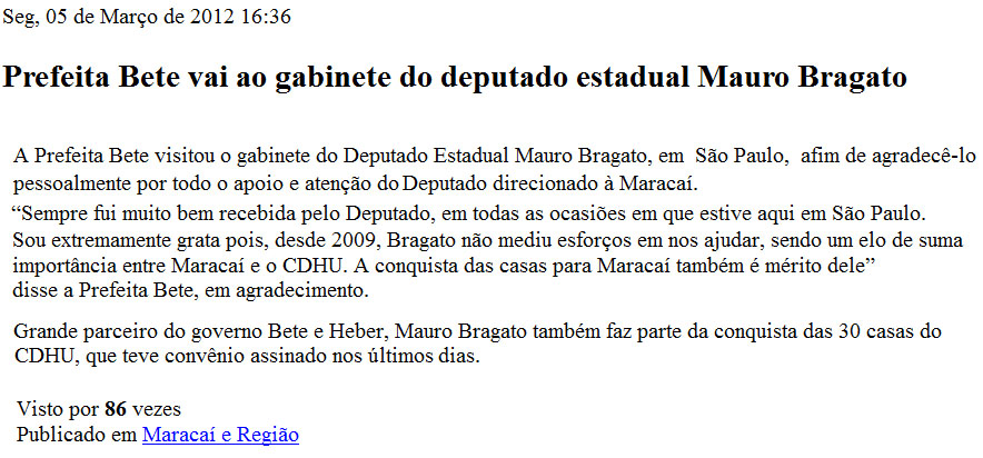 PORTAL MARACAI - 05/03/12 - Prefeita Bete vai ao gabinete do deputado Mauro Bragato