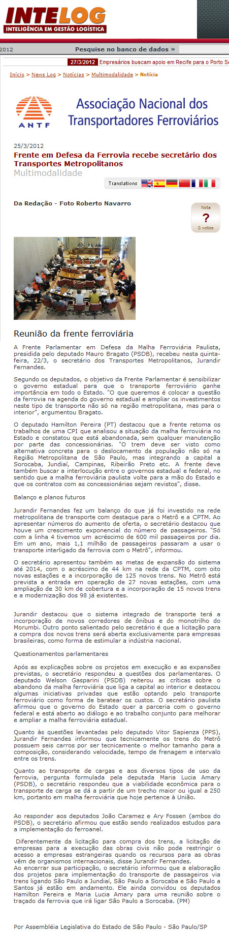 INTELOG - 25/03/12 - Frente das Ferrovias recebe secretario dos Transportes Metropolitanos